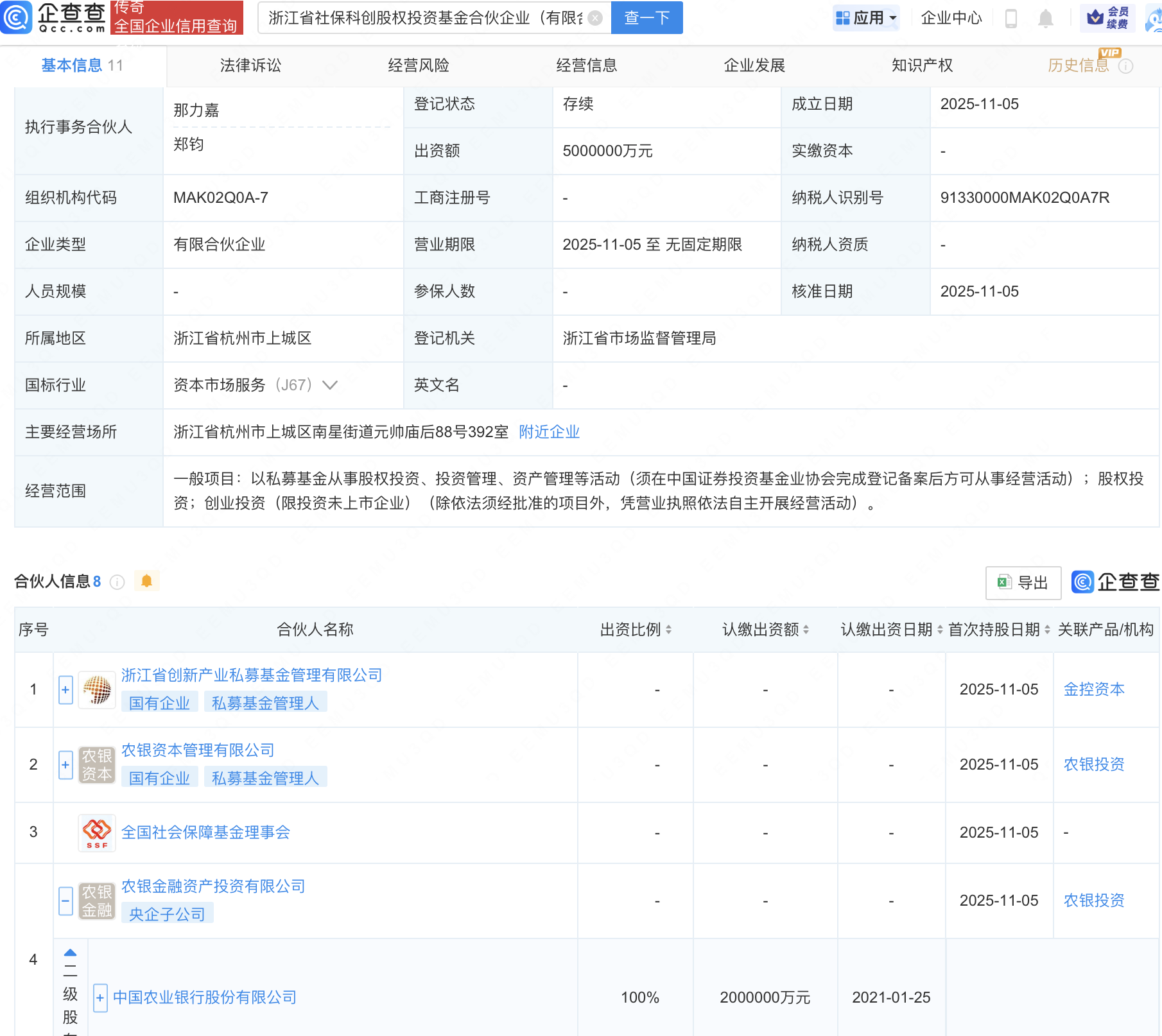 近日,浙江省社保科创股权投资基金合伙企业(有限合伙)成立,出资额500亿元,经营范围包含:以私募基金从事股权投资、投资管理、资产管理等活动。企查查股权穿透显示,该企业由浙江省创新产业私募基金管理有限公司、全国社会保障基金理事会、农业银行(601288)旗下农银金融资产投资有限公司等共同出资。